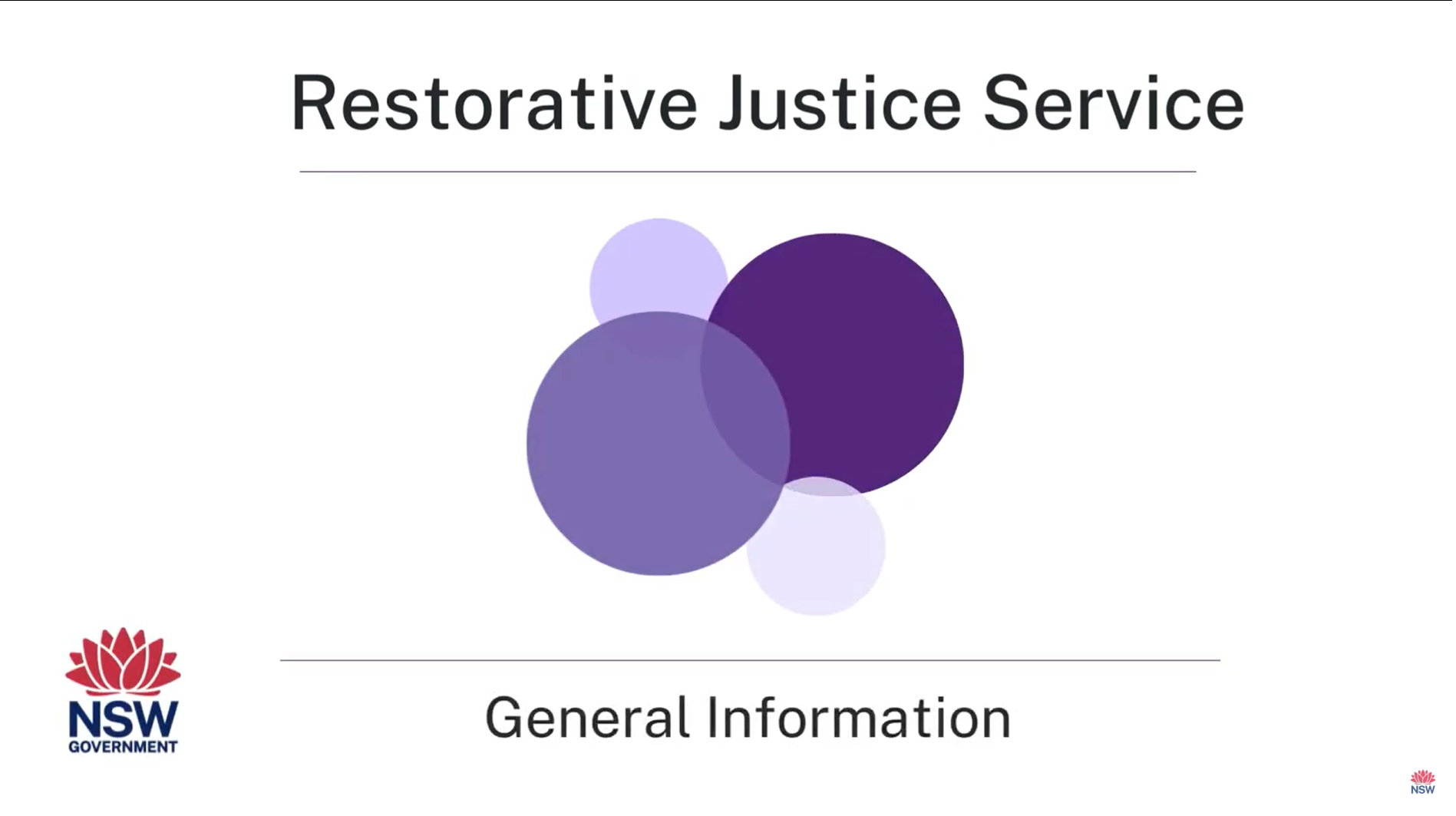 This video contains general information about the New South Wales restorative justice service the following topics will be covered one what is restorative justice two who is the service for three what are the benefits four how does it work five is there any legal impact and six who runs the service what is restorative Justice. What is Restorative Justice. Restorative justice aims to help address the harm that was caused by an offense this is done by providing a safe voluntary and confidential way in which those involved can discuss three questions. what happened? how were people harmed? what can be done to address the harm? who is the service? Who is the service for?